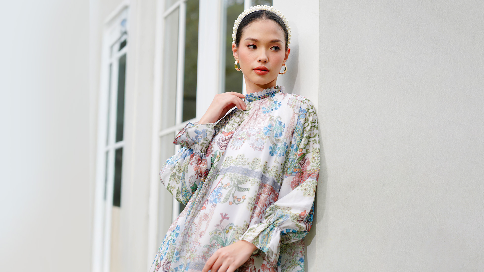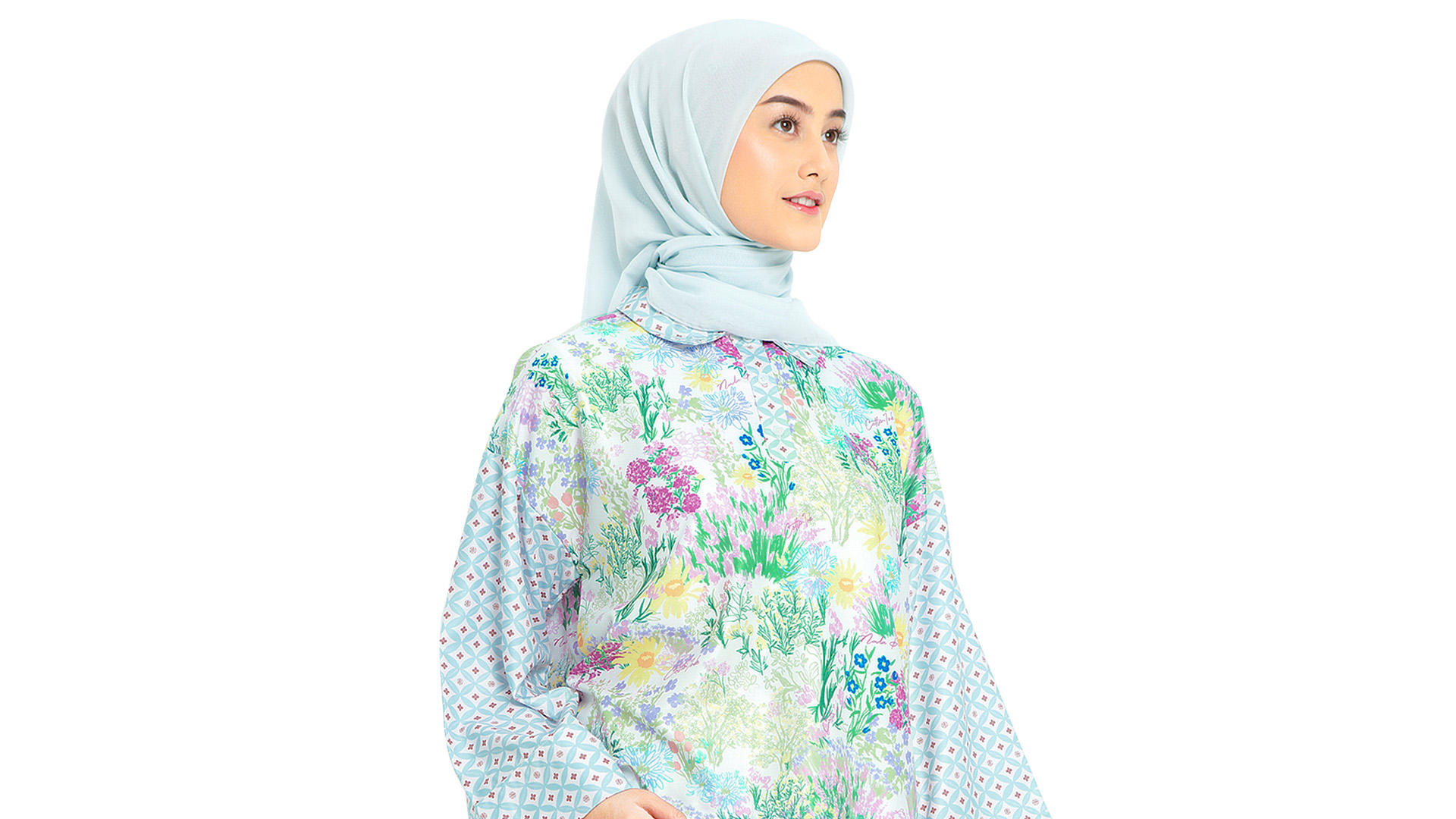 Baik gamis dengan lengan balon, serutan di pinggang, maupun berlayer akan tampil lebih menonjol jika menggunakan kain print eksklusif dari Alia Digital Printex.